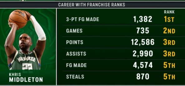 华体会官网-雄鹿功勋!米德尔顿1382记三分队史第一 多项数据排在雄鹿前五